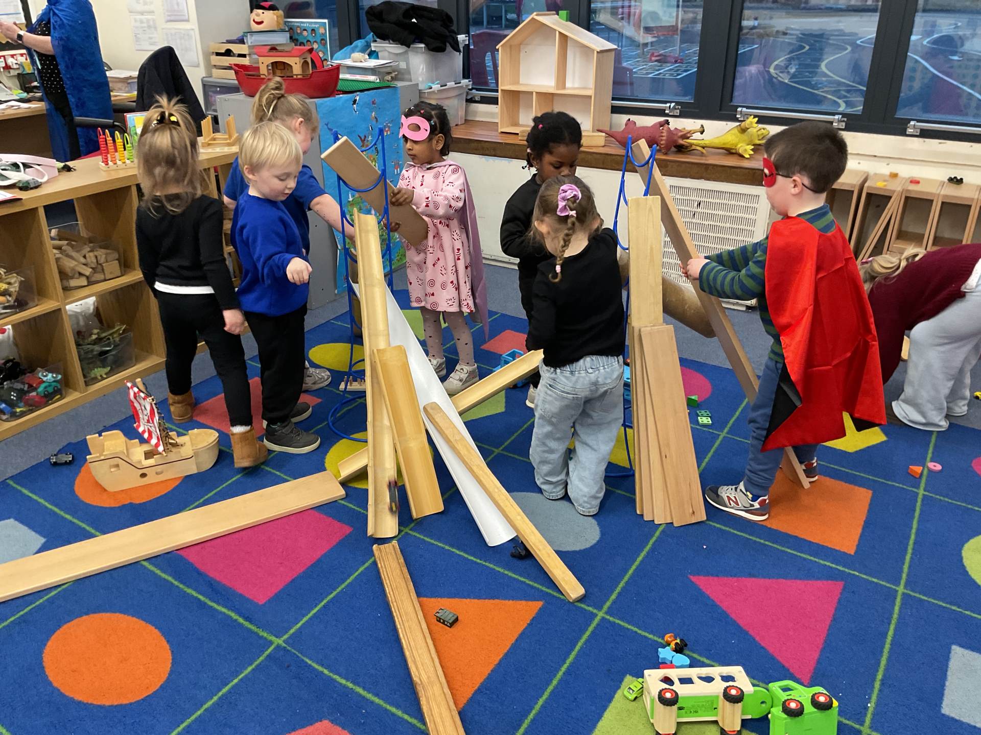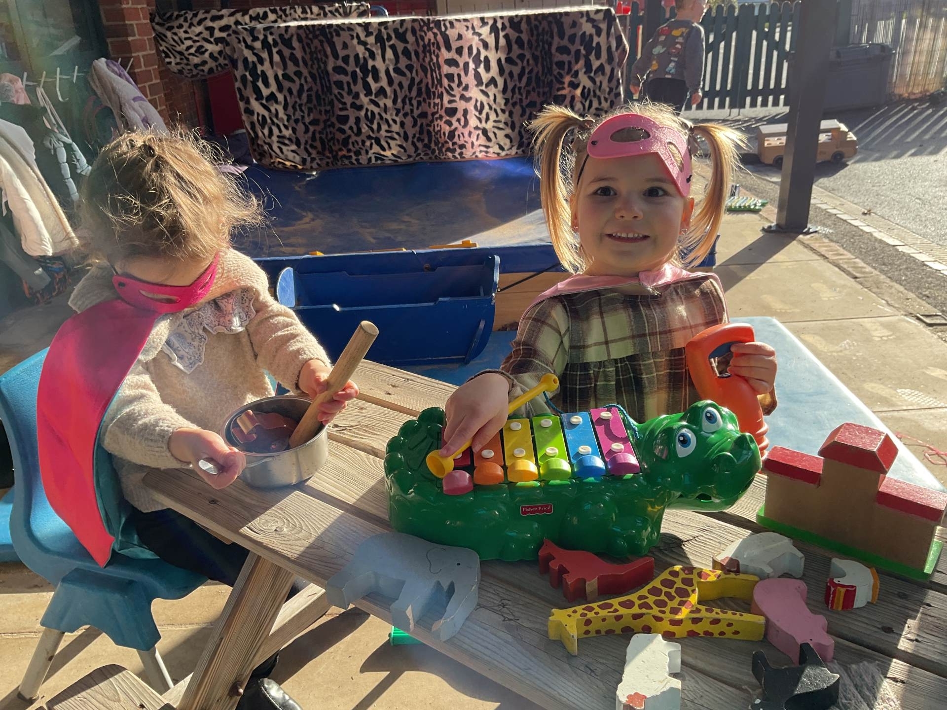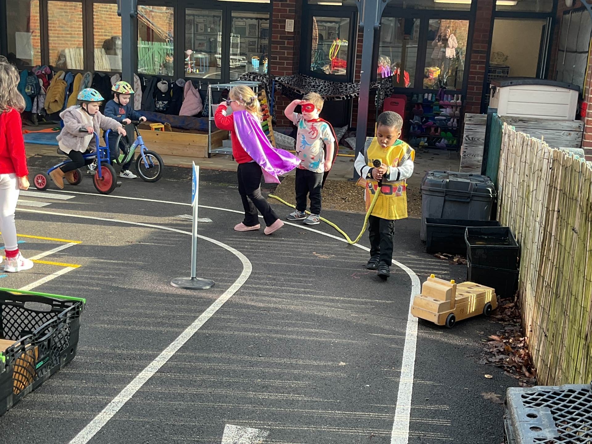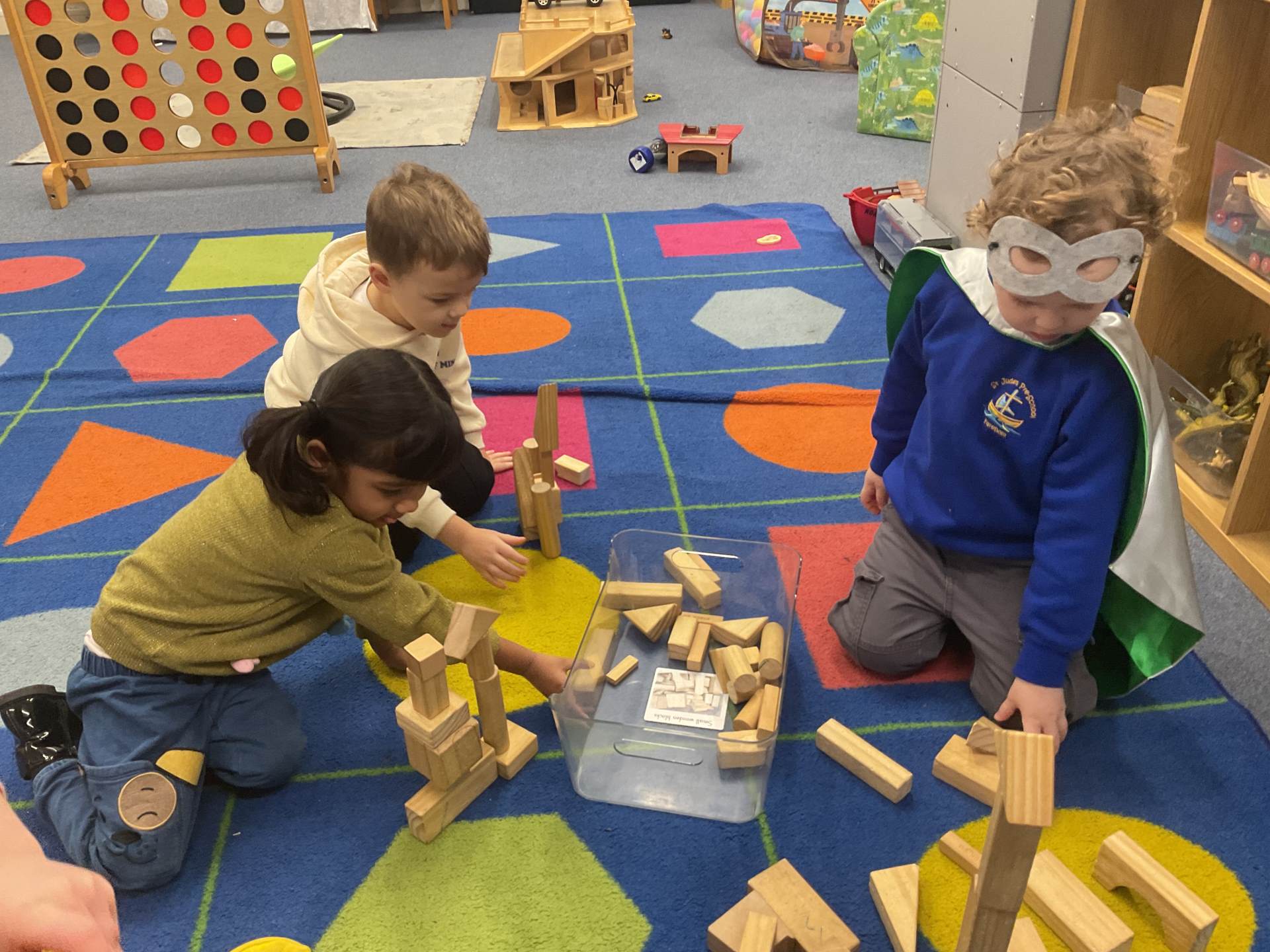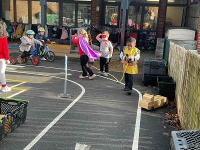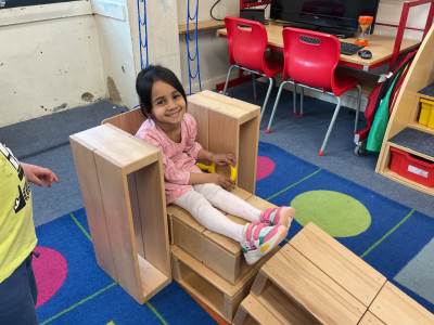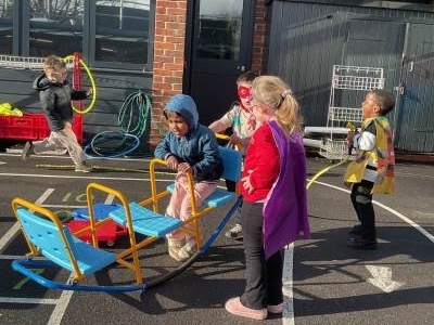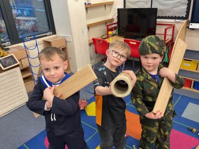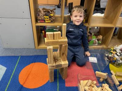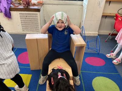 The pre-school children have amazing imaginations! They made rockets, boats etc. using the wooden blocks. The children pretended to be vets, hairdressers, palaeontologists, police, fire officers, military personnel, superheroes and farmers.