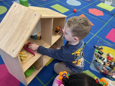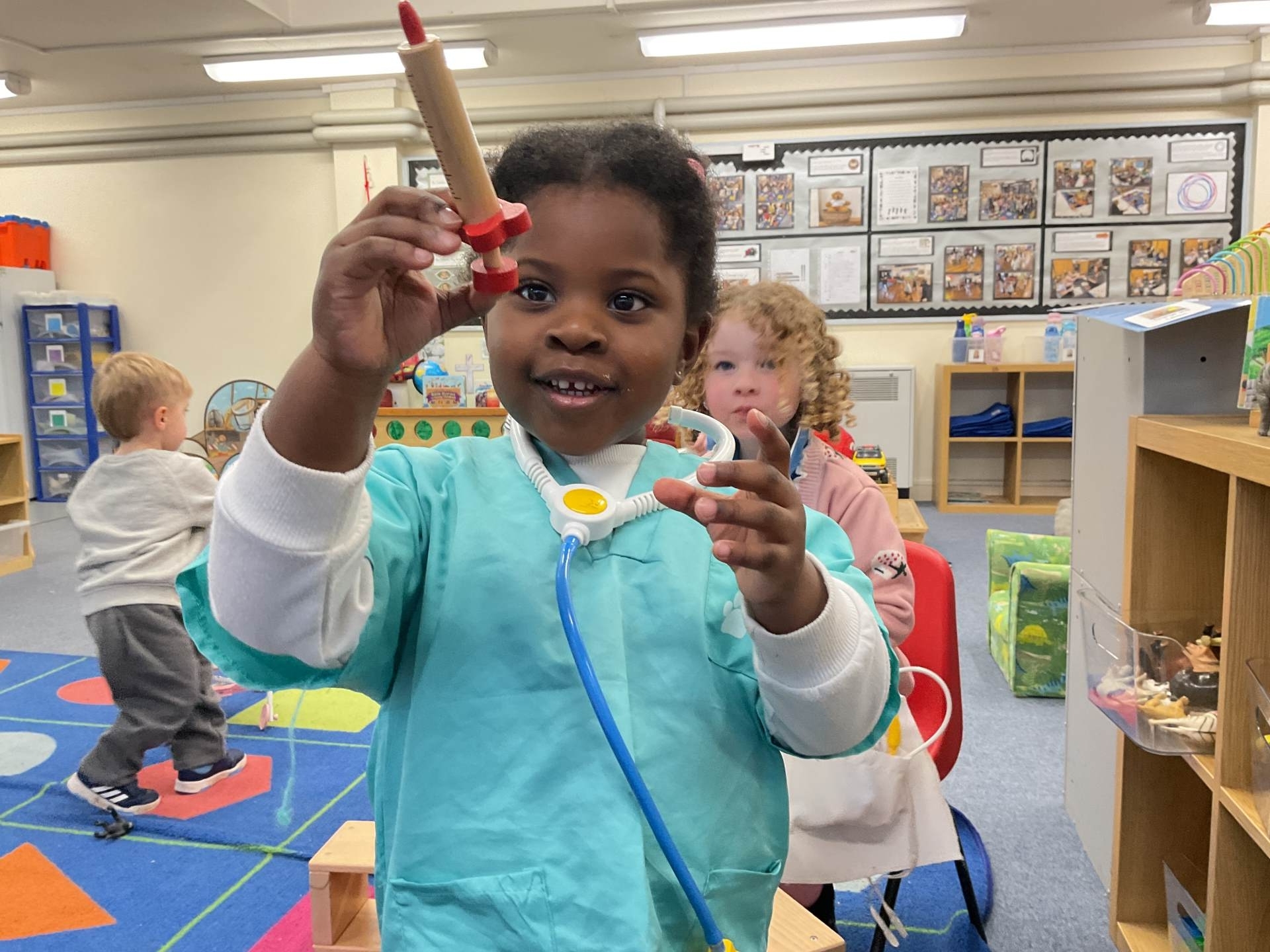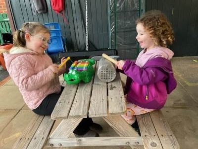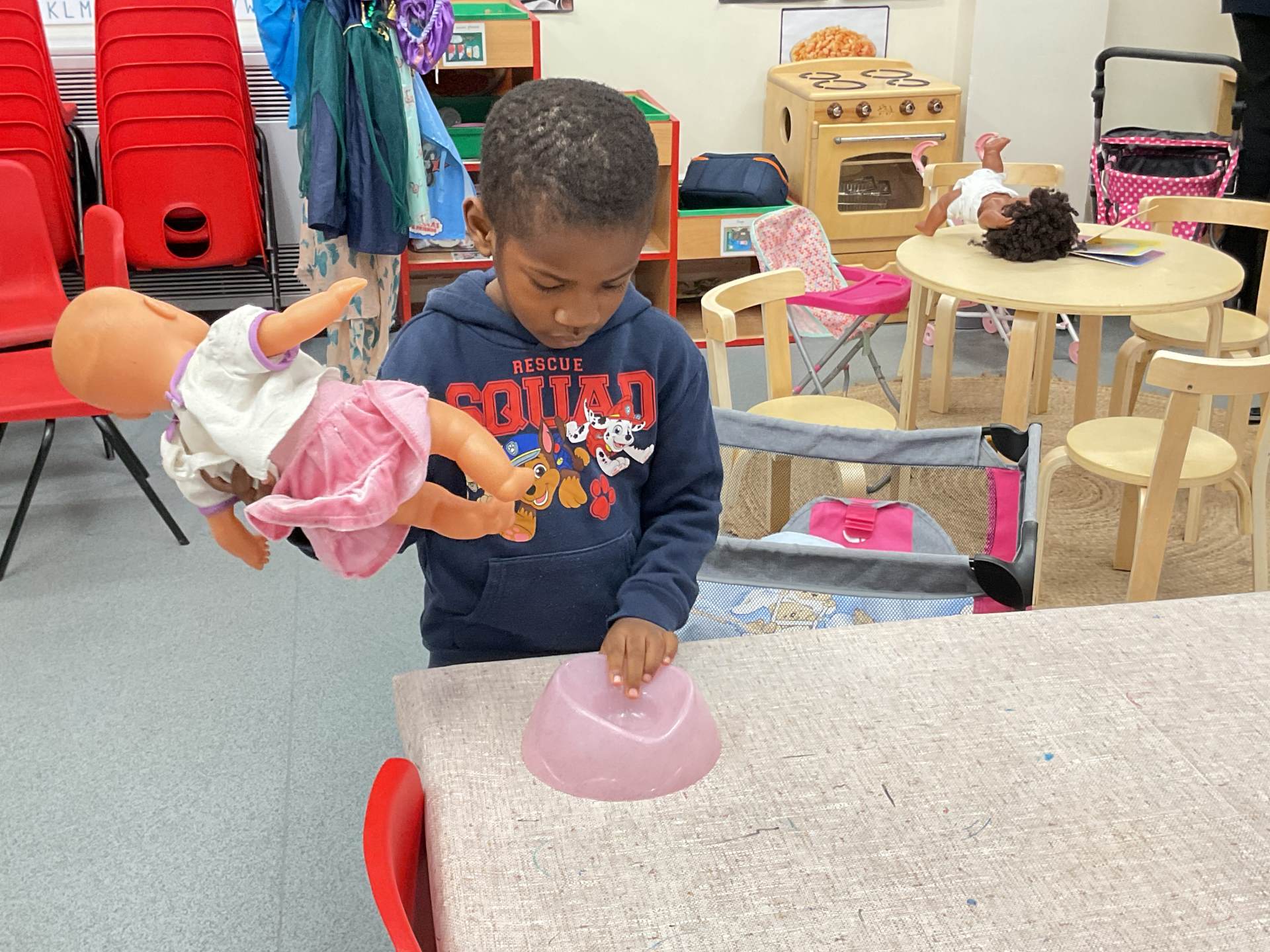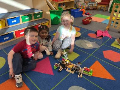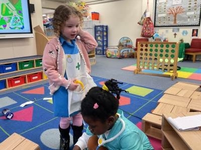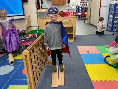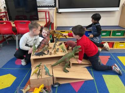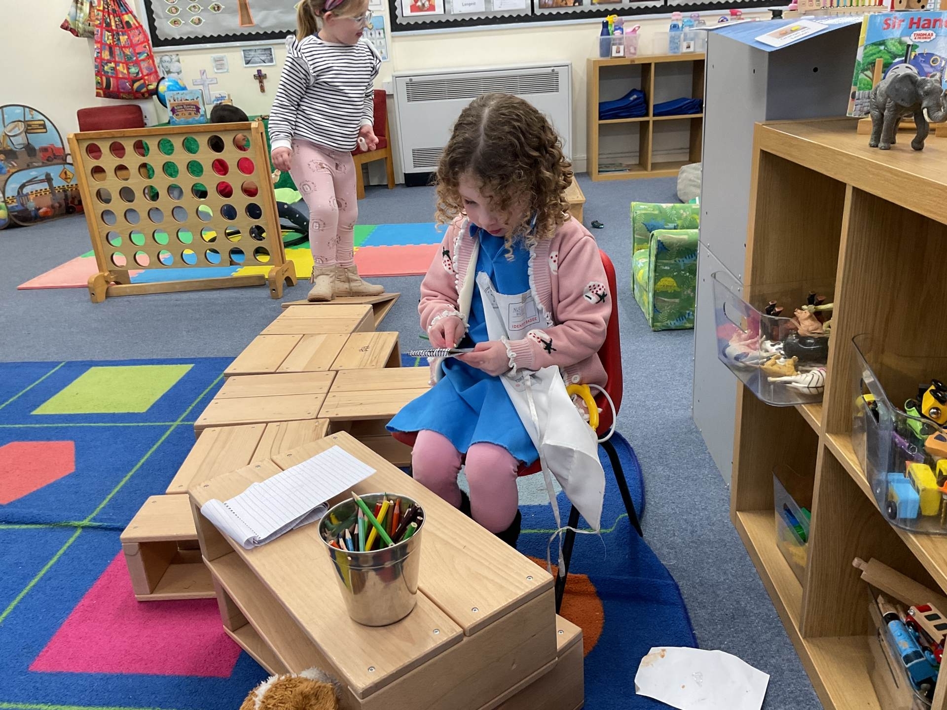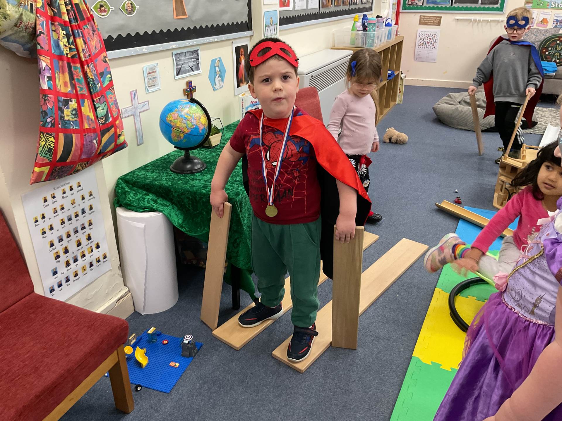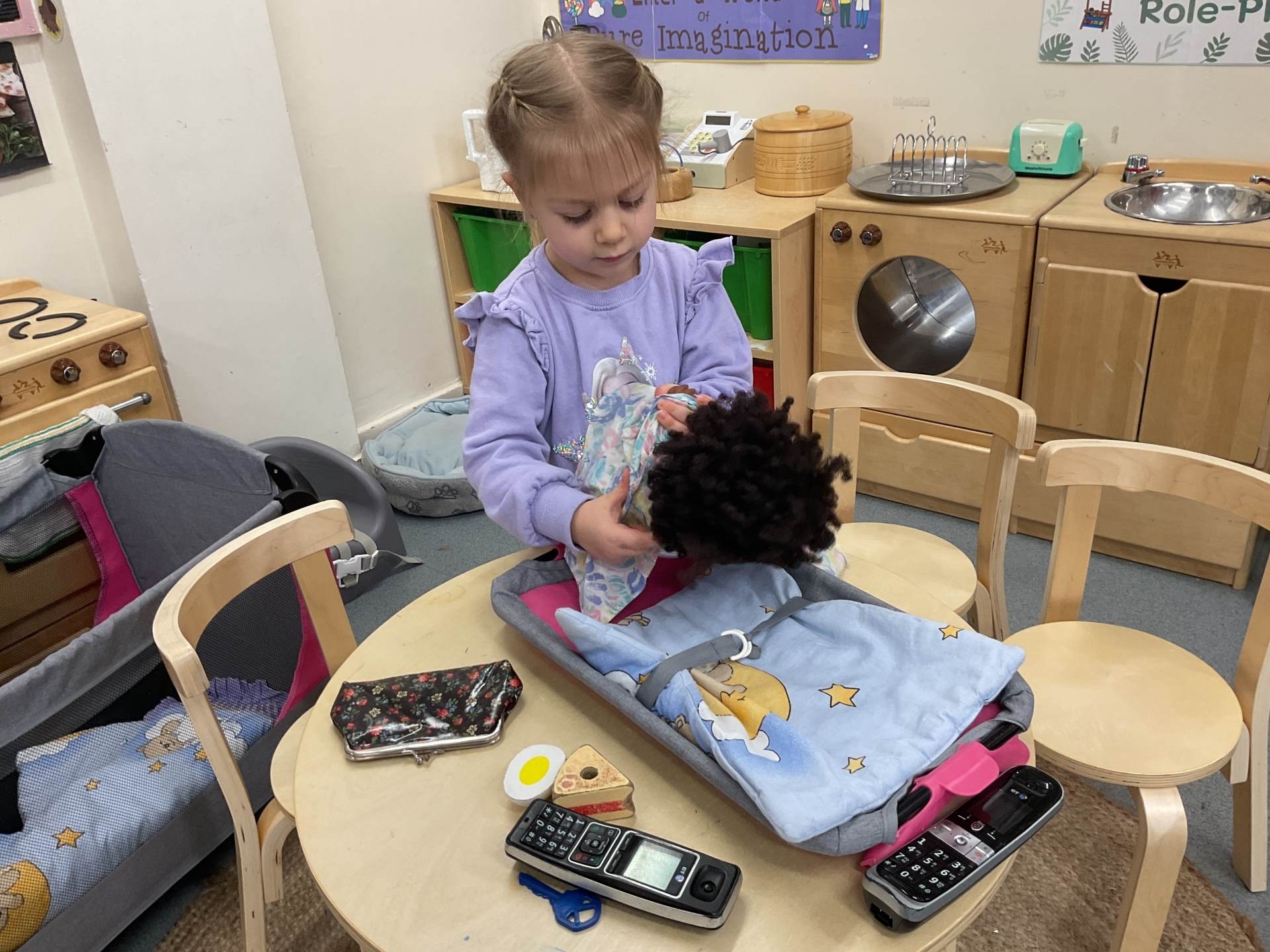 The pre-school children have amazing imaginations! They made rockets, boats etc. using the wooden blocks. The children pretended to be vets, hairdressers, palaeontologists, police, fire officers, military personnel, superheroes and farmers.