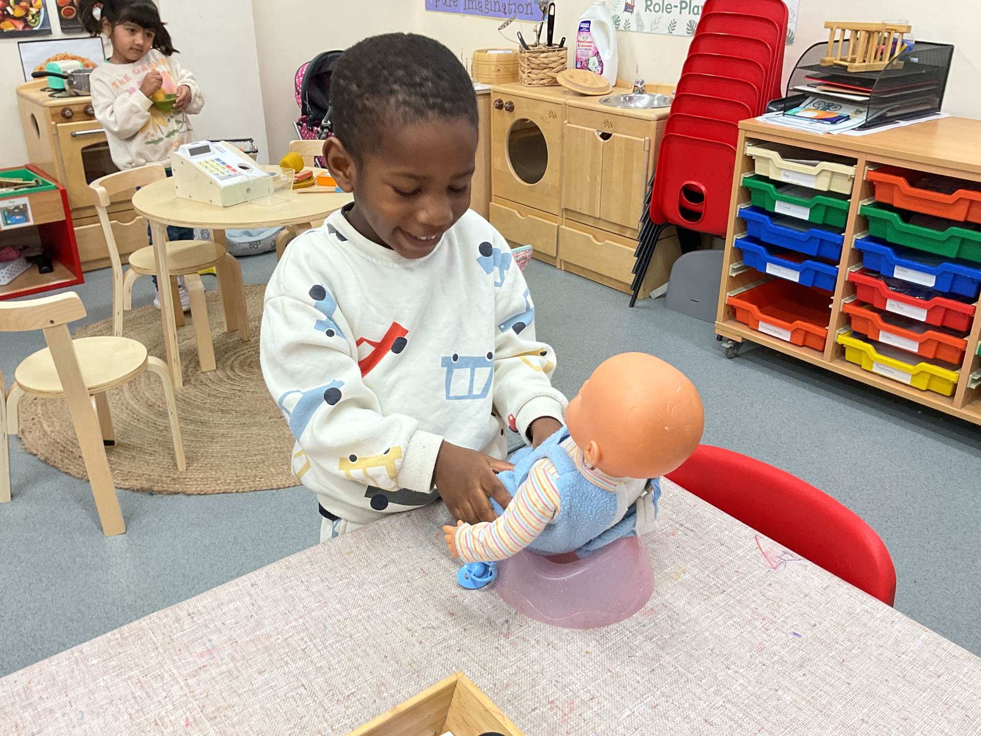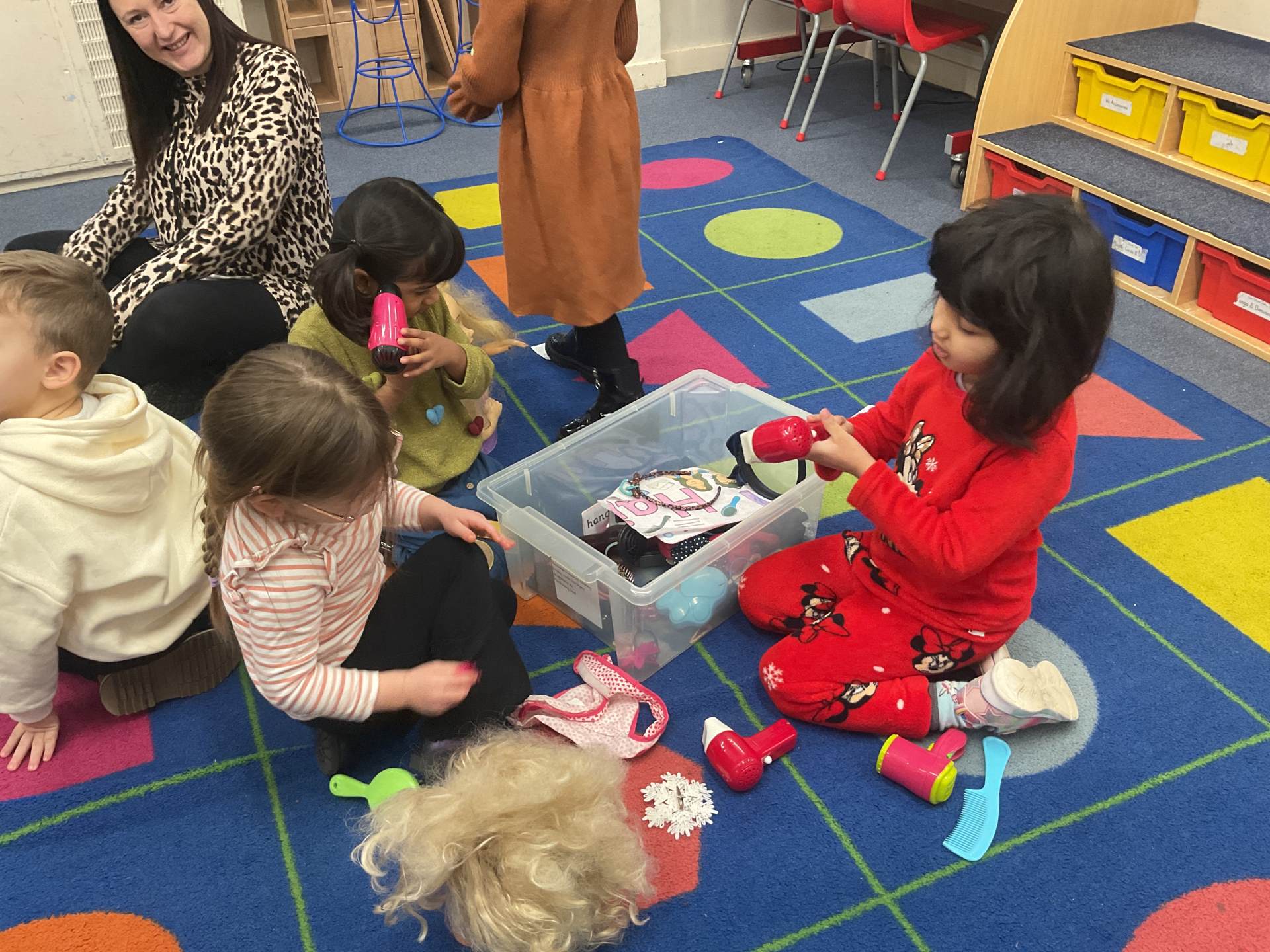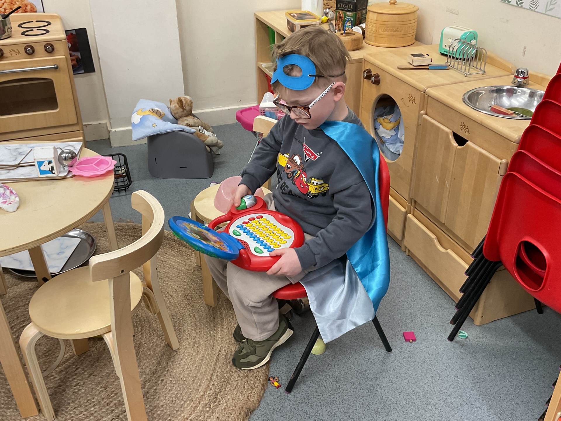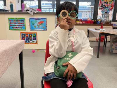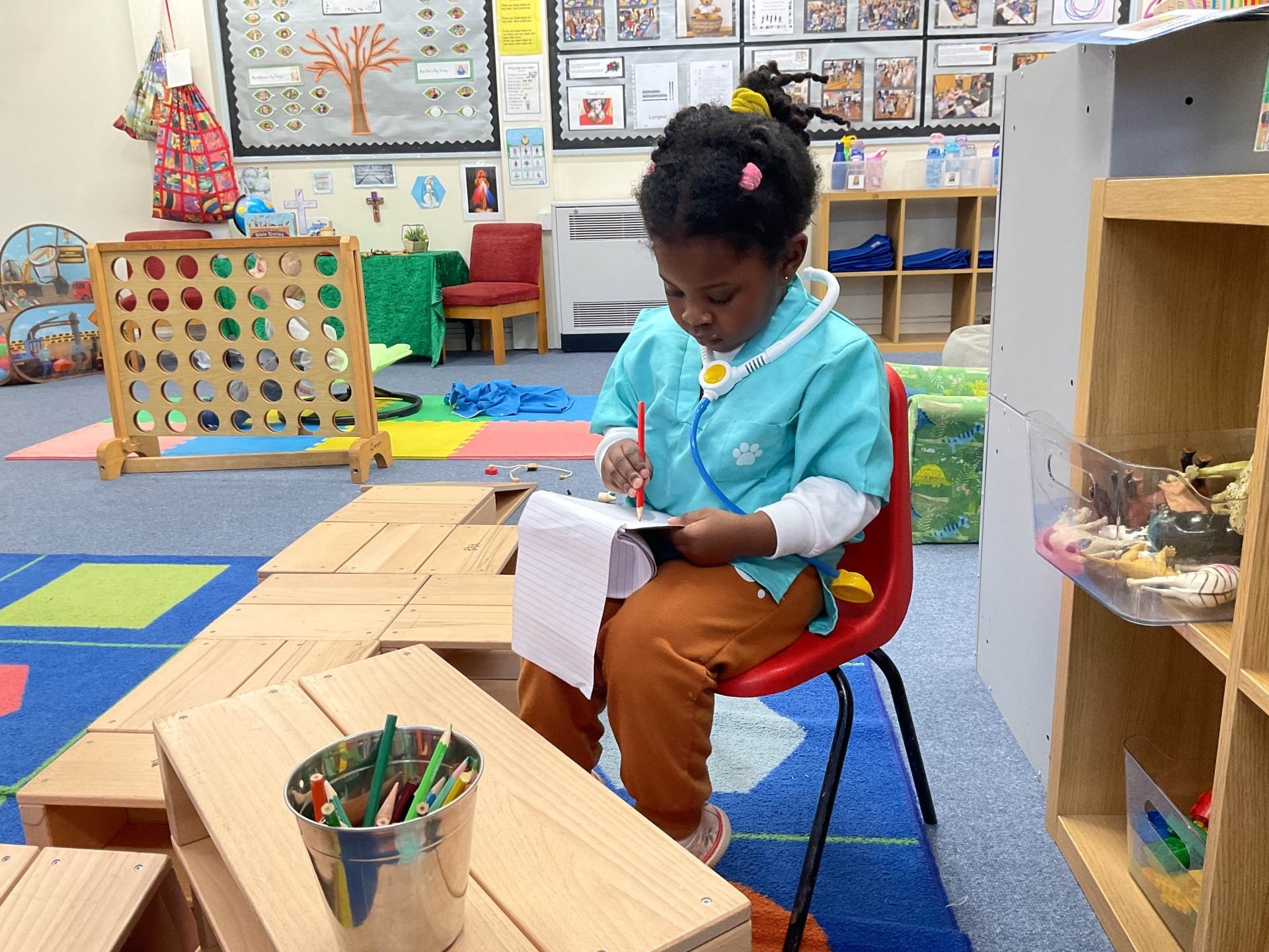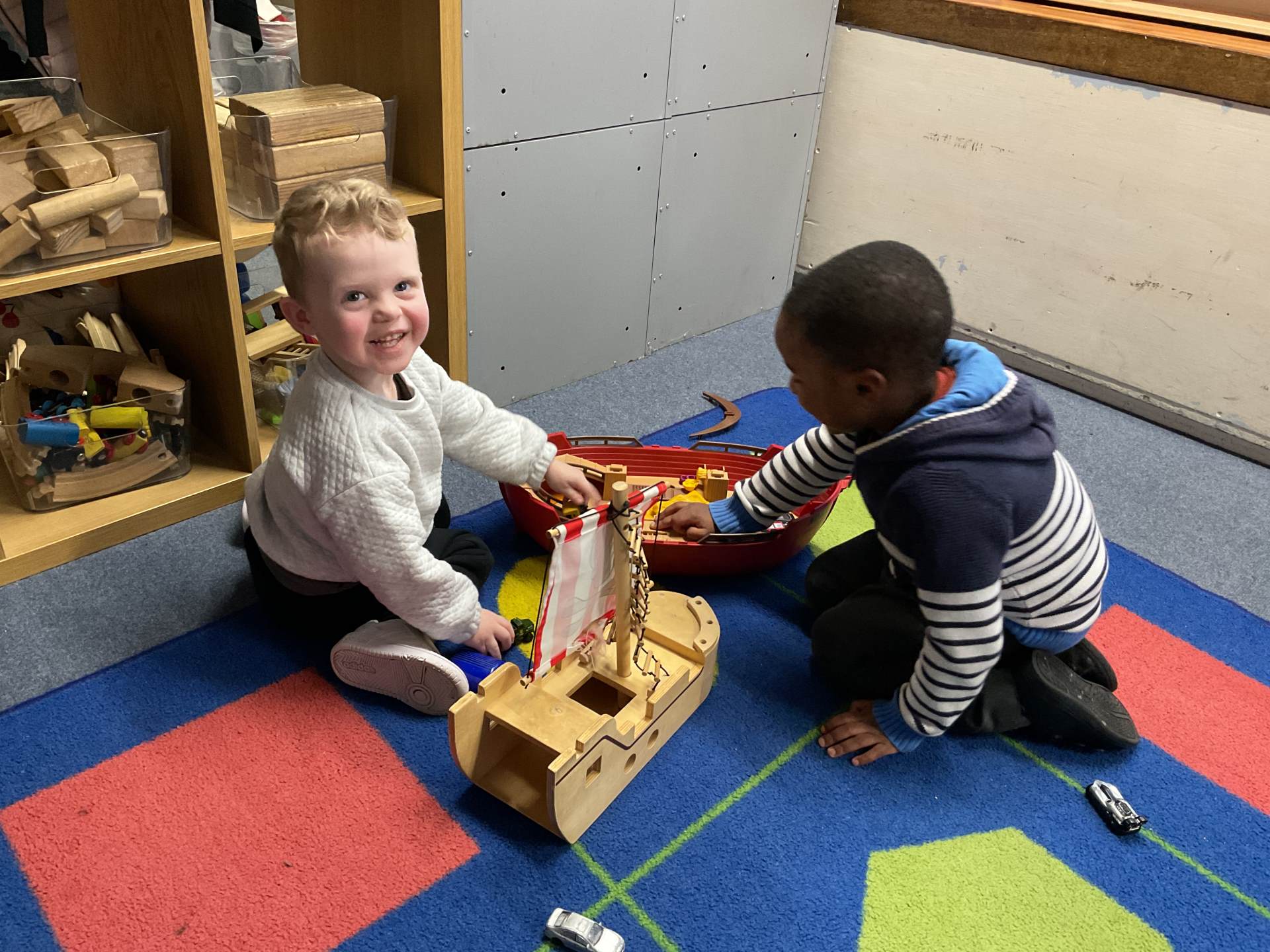 The pre-school children have amazing imaginations! They made rockets, boats etc. using the wooden blocks. The children pretended to be vets, hairdressers, palaeontologists, police, fire officers, military personnel, superheroes and farmers.